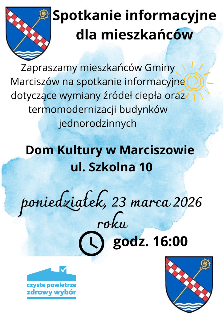 Spotkanie odbędzie się 23 marca 2026 r. (poniedziałek) w Domu Kultury w Marciszowie przy ul. Szkolnej 10 o godzinie 16:00.
