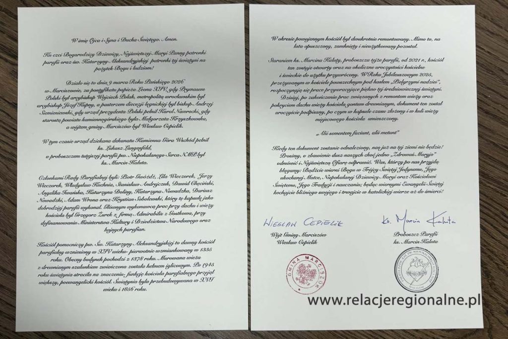 W Marciszowie zakończono ważny etap renowacji zabytkowego kościoła pw. św. Katarzyny. W odnowionej wieży świątyni umieszczono kapsułę czasu, zawierającą dokument opisujący obecny moment w historii parafii i gminy.